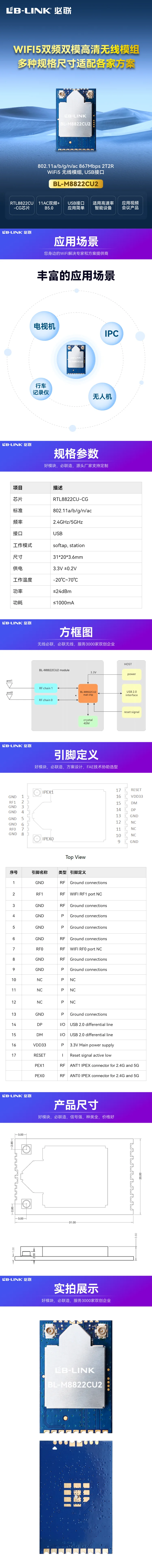 2T2R 802.11a/b/g/n/ac WiFi+B5.0模组